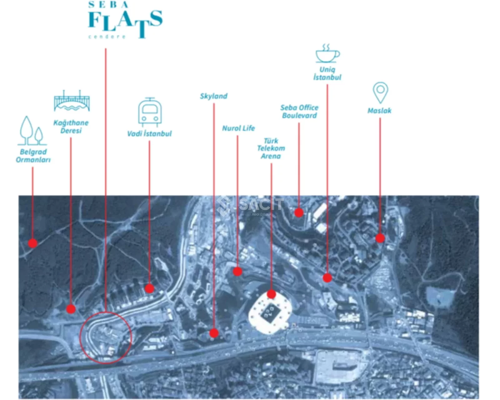 Seba Flats, rising in Kağıthane Cendere Valley with the signature of Seba İnşaat, is one of the prominent projects of Istanbul with its location and the quality of life it offers. The project, designed as a 13-storey twin block on a land of 10,040 m², has a total of 202 residences and a market area of 7,500 m².